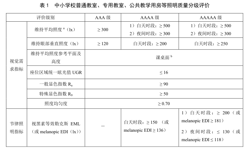 本標(biāo)準(zhǔn)在照明質(zhì)量分級(jí)評(píng)價(jià)中不僅規(guī)定了視覺(jué)需求指標(biāo),還規(guī)定了節(jié)律照明指標(biāo),還有照明系統(tǒng)要求與節(jié)能要求。